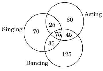 Directions (Q. No. 21 – 22) : These questions are based on the information and diagram given below : A survey was conducted on a sample of 500 cinema artists with reference to their proficiency in the skill of acting, singing and dancing. The results of the survey are depicted in the given Venn diagram.