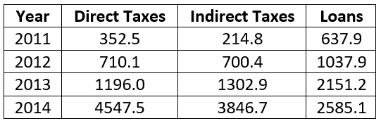 8. What is the contribution in percentage of direct and indirect taxes over four years (rounded to two decimal points) ?