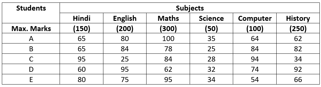 The following table gives the percentage of marks obtained by five students in six different subjects in an examination.