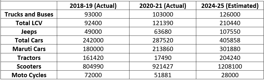 5. What is the approximate estimated growth (in percentage terms) in the production of scooters and motor cycles between 2020-21 and 2024-25 ?